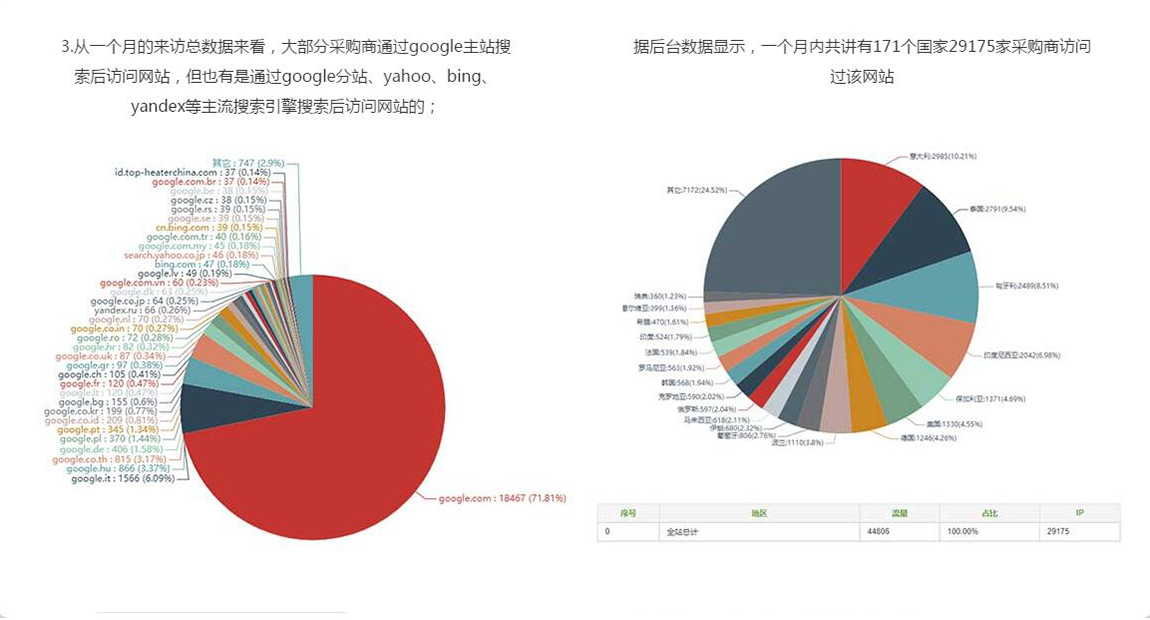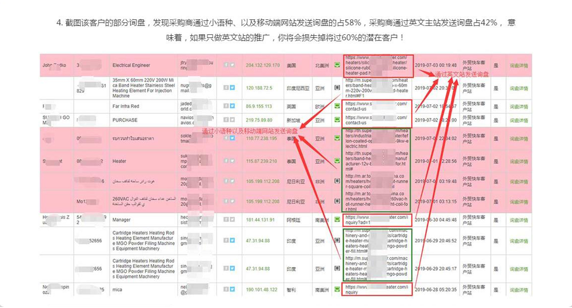 該案例客戶是深圳一家做電熱器元材料的制造商,最初只是一個在民房里辦公的典型Soho公司,靠著給采購商寫開發(fā)郵件接了一些零散的,碎片化的訂單,新定單的增長越來越少,一次偶然的機會遇到了外貿(mào)快車,于2016年5月底與思億歐合作了外貿(mào)快車,現(xiàn)在是合作的第3年,外貿(mào)快車搭建的營銷型網(wǎng)站每日能為他帶來1100+企業(yè)的瀏覽量,整個網(wǎng)站在Google首頁有排名關鍵詞數(shù)量高達1477個,網(wǎng)站留言的詢盤1000多封,直接發(fā)送郵件的詢盤近1000封,且在最近一年里在線即時咨詢的客戶數(shù)量超過150個,除此之外,還有一些直接通過電話咨詢的;據(jù)客戶的反饋,這些詢盤的轉化率高達60%;目前公司團隊由原來的一人soho變成了現(xiàn)在的8個外貿(mào)業(yè)務員,2個內(nèi)貿(mào)業(yè)務員,公司不斷在壯大,幾乎每個月都有采購商來驗廠,公司業(yè)務蒸蒸日上,從之前大眾汽車,到現(xiàn)在換了一輛90萬的路虎;客戶曾打過一個非常形象的比喻,外貿(mào)快車是一門性能優(yōu)良的超級大炮,能把你的產(chǎn)品指哪打哪,前提就是要給足夠的炮彈。